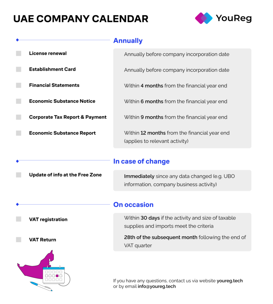 We have collected in one calendar all important things you should not forget to proceed after starting a business in UAE. Check and download it below.